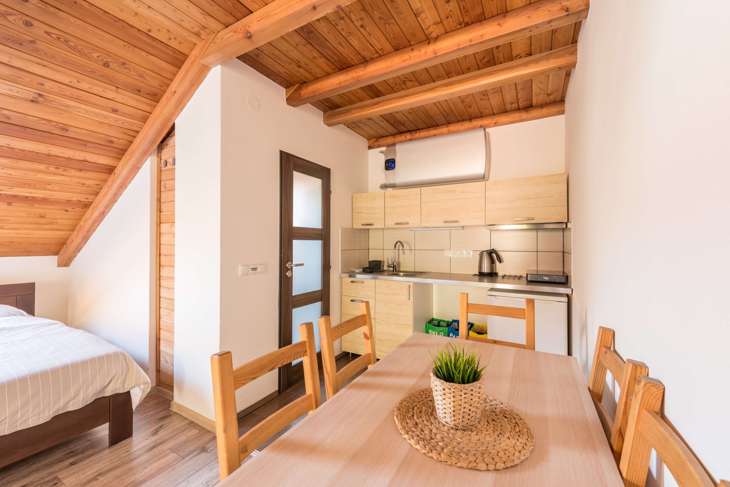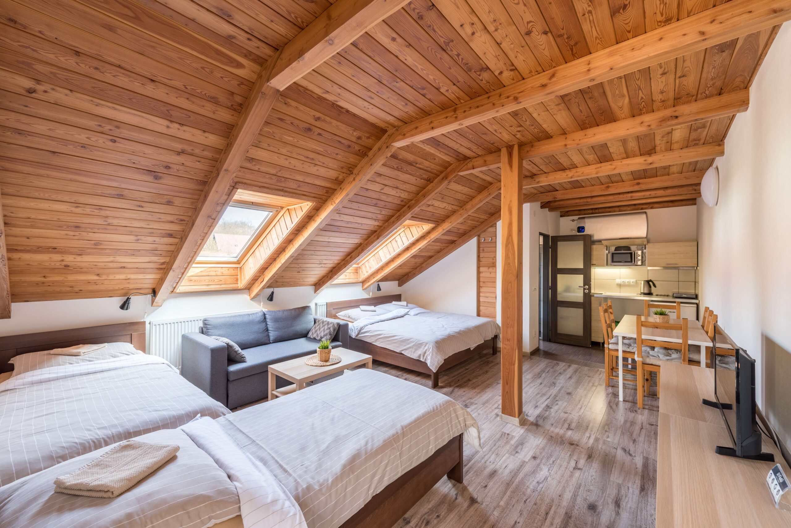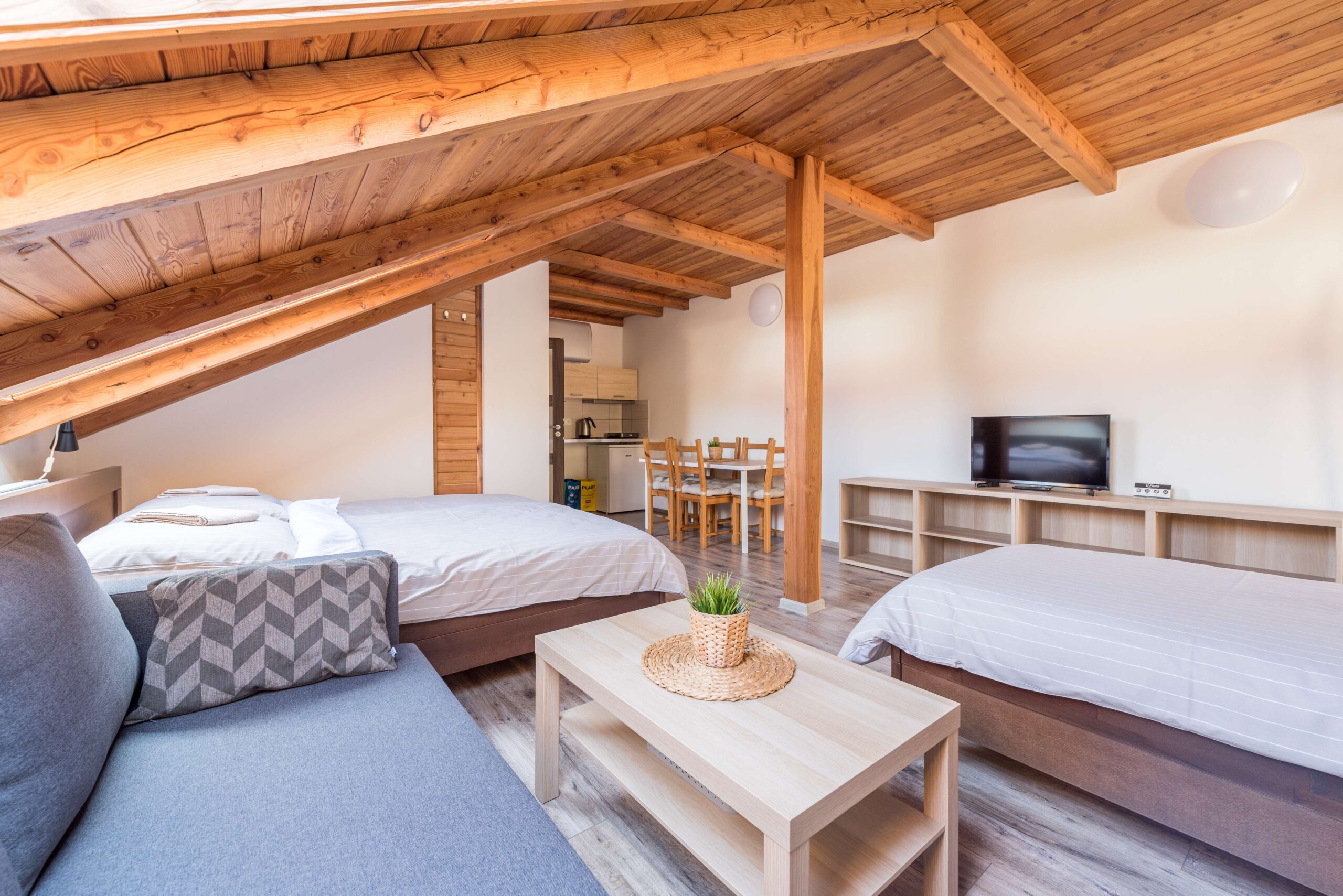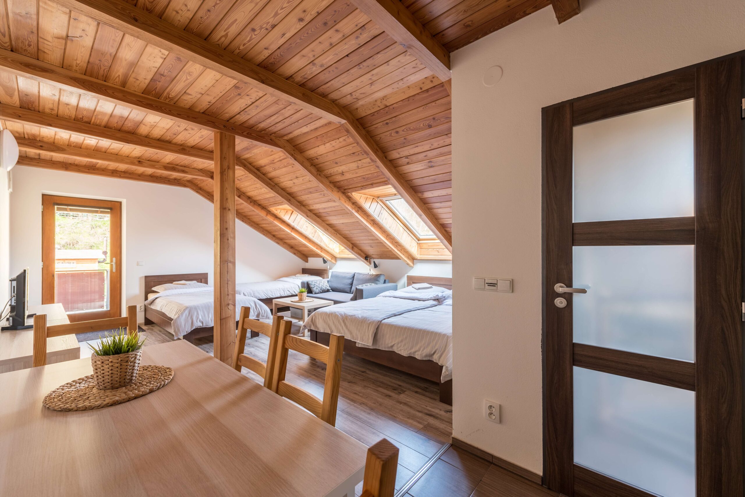 Ubytování v soukromí, v podkroví rodinného domu situované směrem na sever, přístupné ze společného dvora po samostatném venkovním schodišti (majitelé bydlí v přízemí a jsme zde neustále k dispozici). PLNĚ KLIMATIZOVÁNO. Ubytování je nekuřácké. S vlastní plně vybavenou kuchyní, koupelna se sprchovým koutem, pračkou, fénem, obývací pokoj se smart TV a WIFI zdarma. V apartmá najdete 1x dvoulůžko, 2x jednolůžko, 1x rozkládací pohovku, na přání je možno ubytovat až 6 osob. Vhodné jak pro rodiny s dětmi, tak menší skupiny. Soukromé parkování přímo před domem.